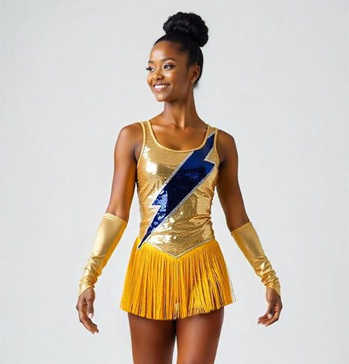 Golden Hour Majorette Bodysuit B33125 by Bandmans is designed to make every performance unforgettable. This majorette bodysuit features a shimmering gold Mystique bodice that shines under the lights, commanding attention from the moment you step on the field. A bold blue lightning bolt crafted in Microsequin, outlined in silver, gives the Golden Hour Majorette Bodysuit its electrifying edge.