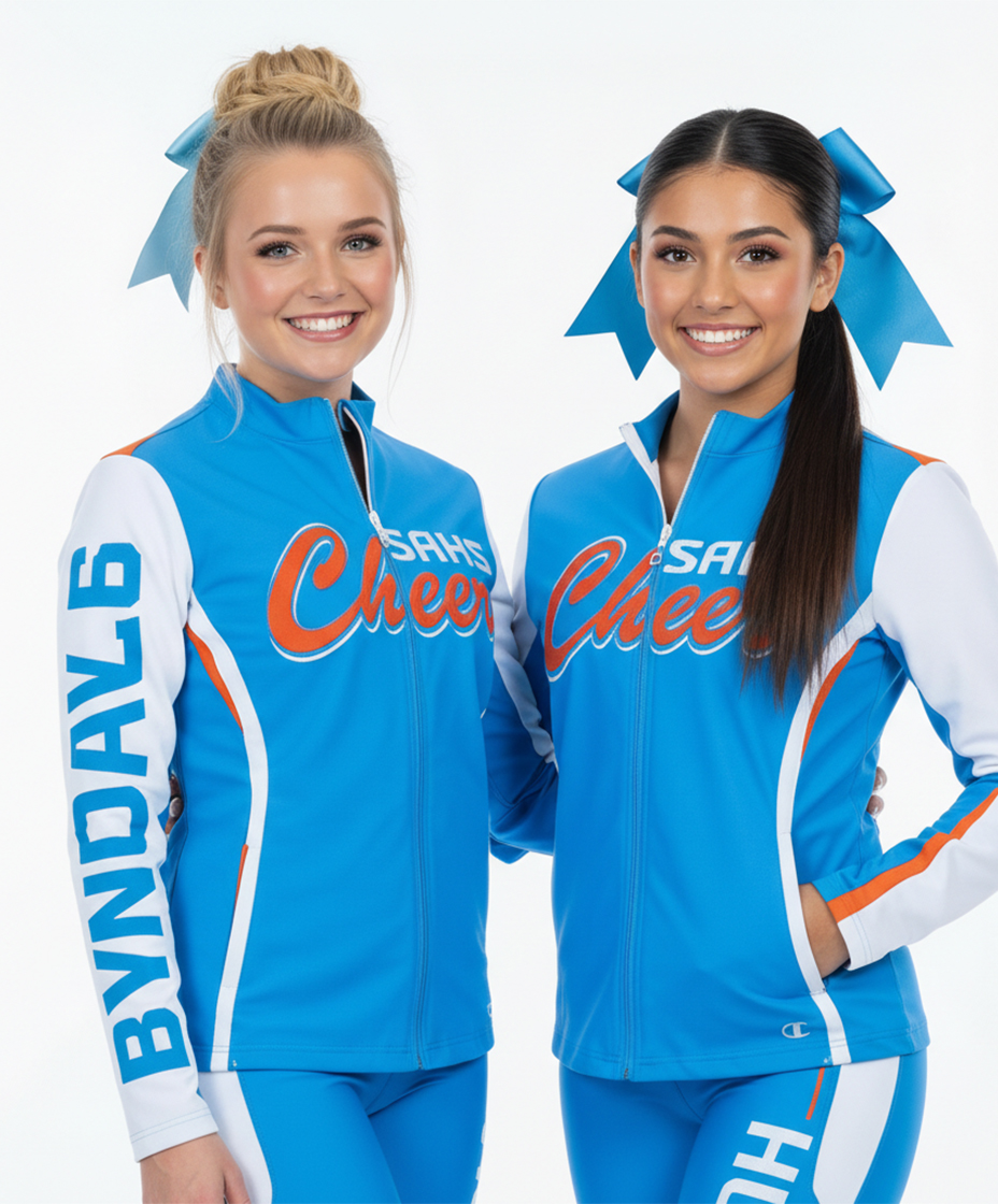 Shown in: Carolina/light blue base with white sleeves and contrast panels, bright orange accent piping, “SAHS Cheer” across the chest, “BYNDALE” down the sleeve, and matching leggings with bold vertical “HUSKIES” text plus white/orange side paneling.