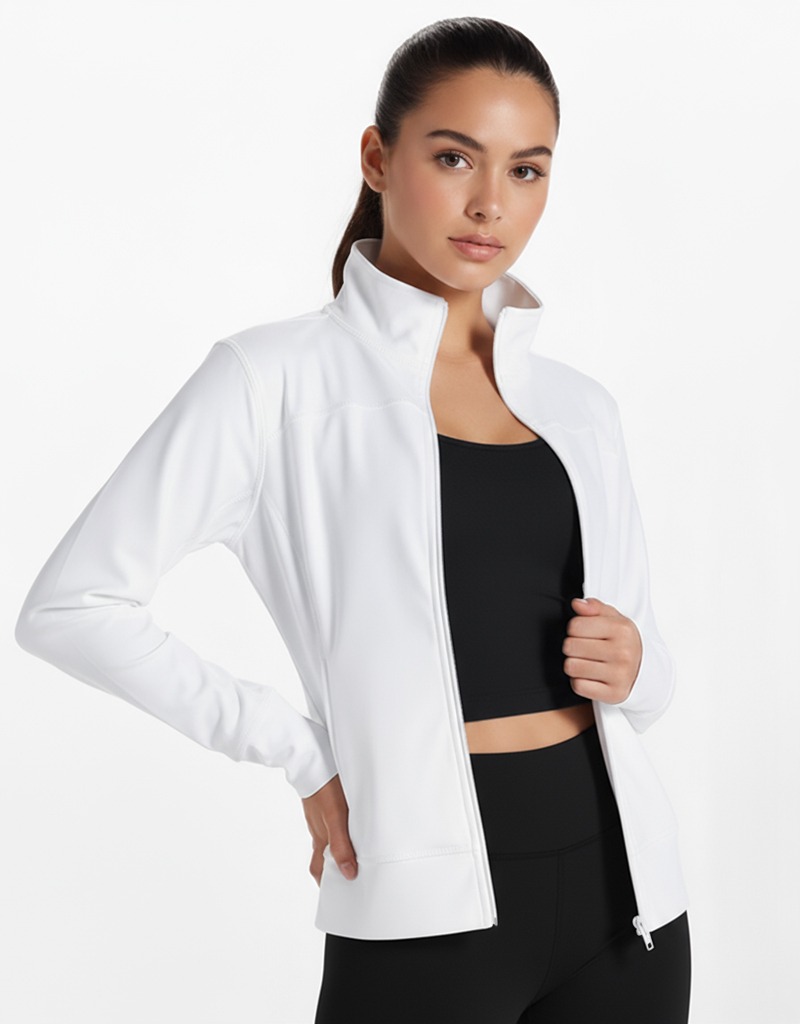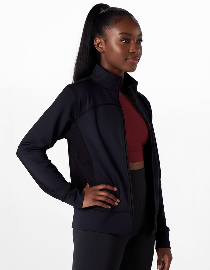 Stay sleek and comfortable in the Zip Up Jacket AH11319, a fitted poly spandex jacket designed for both performance and style. This premium dance warm-up jacket features a zip-front closure, front pockets, and rib knit panels at the sides and sleeves for ultimate flexibility and comfort.